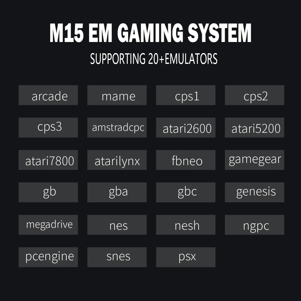 Game Emulators: forforMAME、FC、GB、GBA、GBC、MD、SFC、PS1、GAMEGear、SG -1000、ColecoVision、MasterSystem、PC-Engine、NEOGEOPocket、WonderSwan、Sega Pico、PC-Engine CD、Sega 32X