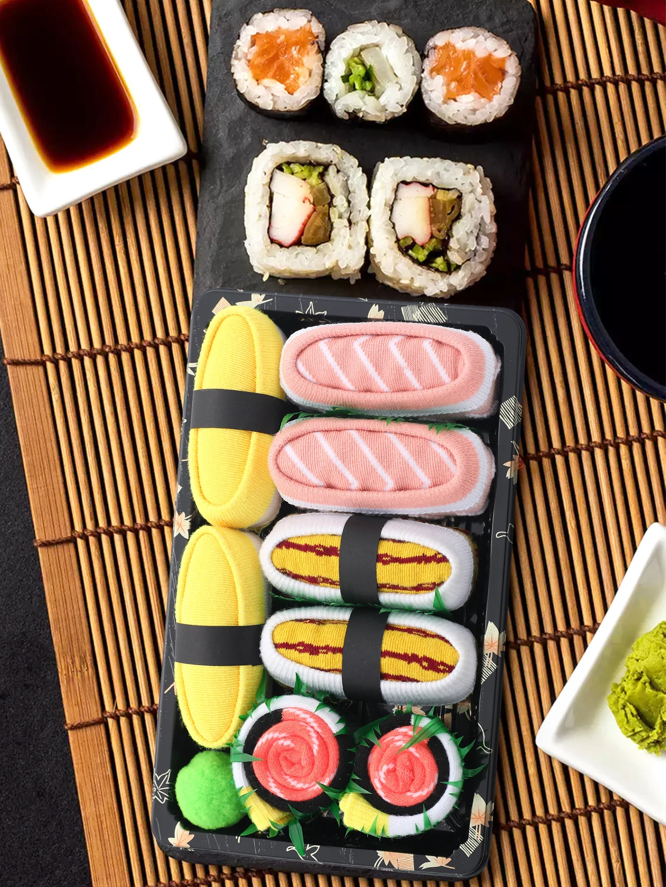 4pair of mid-calf unisex socks in a salmon sushi design, a novel and creative practical gift that is fun for the holidays.
